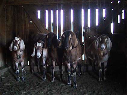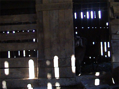 Squeegee is standing in the door frame of the barn where she lives with the other goats.
